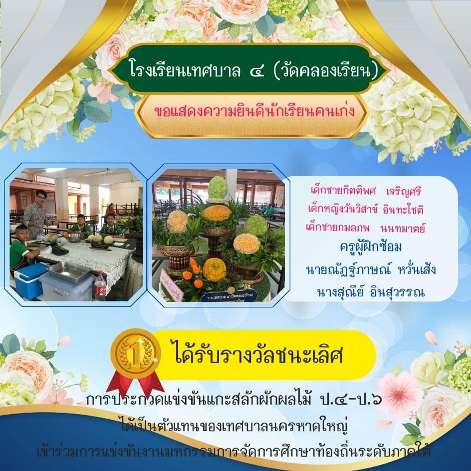 วันที่ 14 มีนาคม 2567 โรงเรียนเทศบาล ๔ (วัดคลองเรียน) โดยนายมนิต นิลโมจน์ ผู้อำนวยการสถานศึกษา มอบหมายนางชัยทิพย์ พิชญเวทย์วงศา รองผู้อำนวยการสถานศึกษา ร่วมพิธีสมโภชสัญญาบัตร พัดยศ ผ้าไตร และฉลองวัฒนมงคล ครบ 58 ปี พระครูวรวัฒน์สมานคุณ พระบาทสมเด็จพระวชิรเกล้าเจ้าอยู่หัว โปรดพระราชทานสมณศักดิ์ให้พระครูปลัดธรรมวงศานุวัตร (กฤตพรต กนฺตสีโล) ผู้ช่วยเจ้าอาวาสวัดโคกสมานคุณ พระอารามหลวง เลขานุการเจ้าคณะจังหวัดสงขลา เป็นพระครูสัญญาบัตร ผจล.ชอ ในราชทินนามที