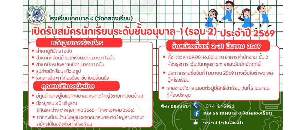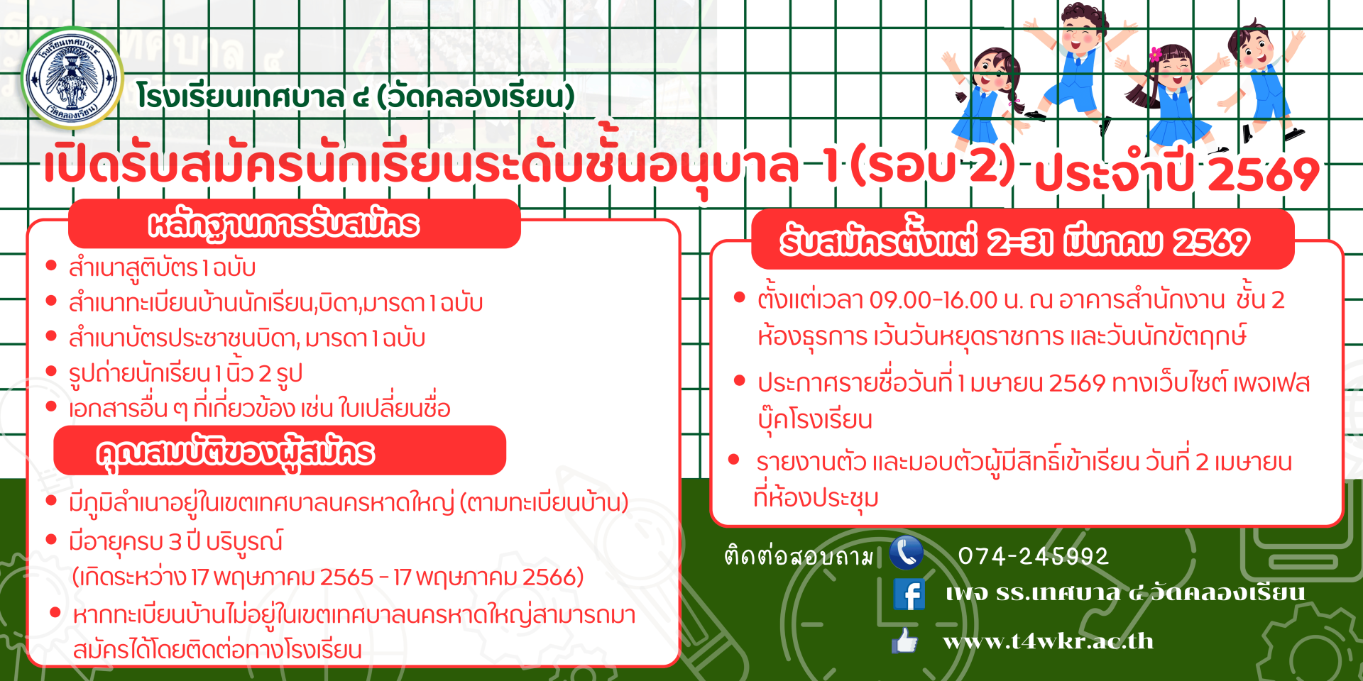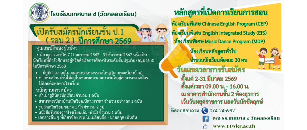 เปิดรับสมัครนักเรียนระดับชั้นอนุบาล 1 และชั้นประถมศึกษาปีที่ 1 (รอบ 2) ปีการศึกษา 2569
