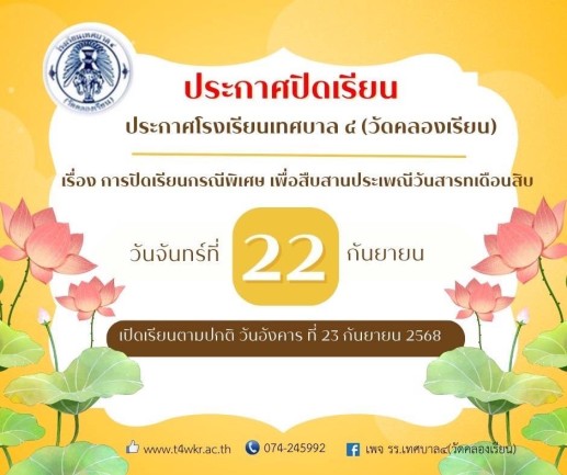 ประกาศปิดเรียนกรณีพิเศษ วันสารทเดือนสิบ วันจันทร์ ที่ 22 กันยายน 2568
